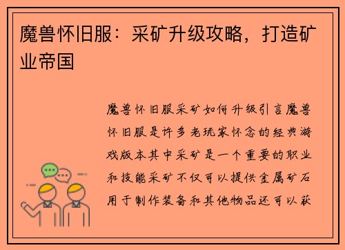 1. 炼金术士的职业特点 炼金术士是魔兽世界中一种强大的法术职业,擅长使用炼金术来制造各种药剂和魔法物品。在怀旧服中,炼金术士的伤害输出可能相对较低,但通过一些技巧和策略,我们可以提升他们的伤害数据。...
